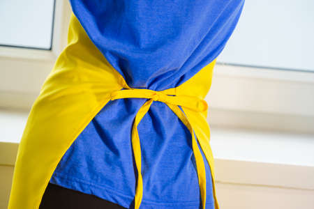 Close up of unrecognizable person wearing tied up yellow apron. Household duties concept