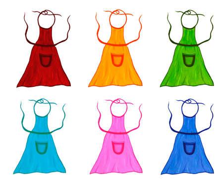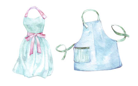 Set of bright colored kitchen aprons with pocket isolated on white background. Cooking food. Watercolor illustration. For the design of cafes, menus, restaurants