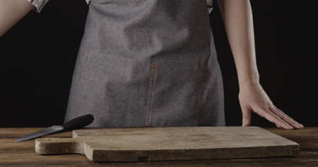 Chef in a apron are standing at the table with wooden cutting board on it on a black background.