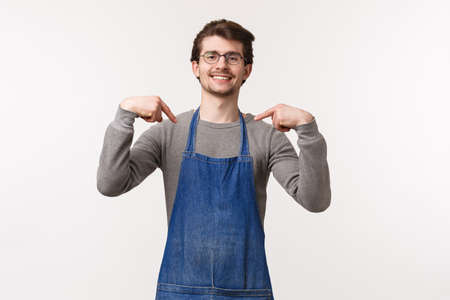 Portrait of confident good-looking professional male barista in apron, coffee shop owner brag he brew best coffee in town, pointing himself boastful, smiling like a pro, white background