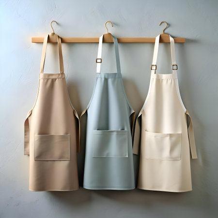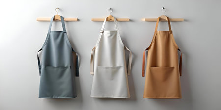 Three clean and stylish aprons hanging on a wooden rack. ready for a day of cooking and baking. The neutral colors and simple design make them perfect for any kitchen.