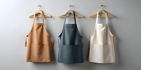 Three aprons in grey. white. and brown. hanging on wooden hangers against a white backdrop. Perfect for showcasing your culinary skills or adding a touch of vintage charm to your kitchen decor.
