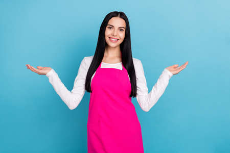 Photo of millennial sweet brunette lady hold empty space wear white cloth apron isolated on blue color background
