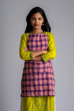 Portrait of Indian woman chef or cook in an apron on grey background.