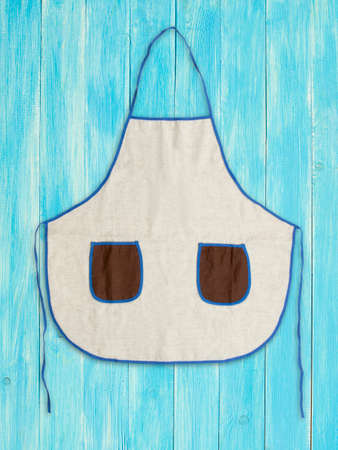 Blank apron with pockets on blue wooden background