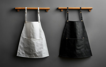 White and black aprons mockup hanging on wall