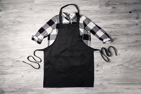Black apron and shirt on a gray background with copy space. Top view
