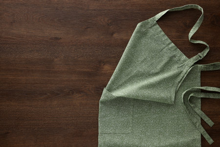 Apron with kitchen utensil on wooden background.