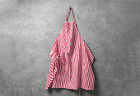 Clean red striped apron on gray tiled wall