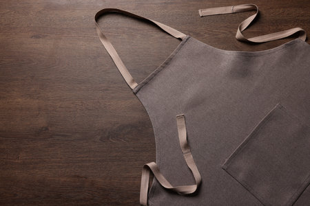 Stylish brown apron on wooden table, top view. Mockup for design