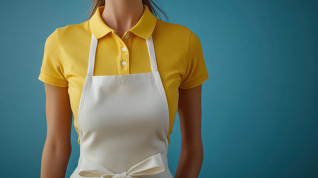 a woman wearing yellow polo shirt, long pant and half white apron, full body, mock up --ar 16:9 --stylize 200 --v 6.1 Job ID: b9c29676-6417-4931-802f-e6b9cf5ca0ae
