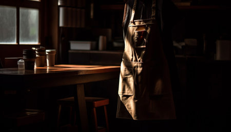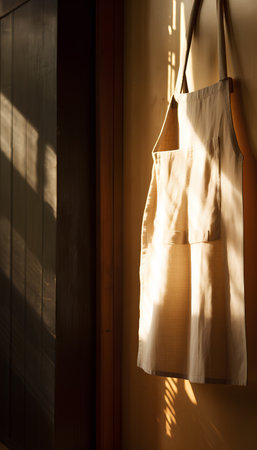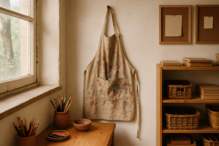 Stained apron hangs on a wall in a craft studio, surrounded by art supplies and warm wooden furniture, evoking a sense of creativity and artistic expression