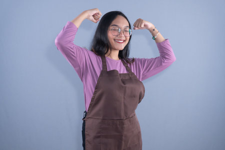 A young Asian woman in a purple top and brown apron, flexing her biceps, smiling confidently