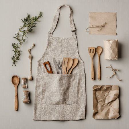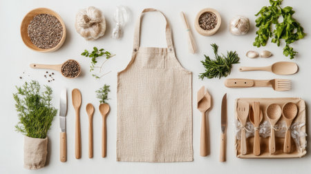 A beautifully arranged flat lay showcasing a linen apron, various wooden utensils, and natural herbs, perfect for any culinary setting or home decor inspiration.