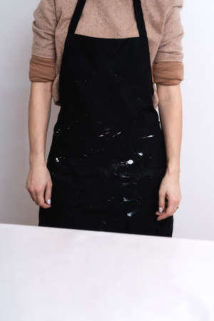 A woman artist in a black apron with drops of paint stands against the wall in her workshop. Artistic background with place for text.