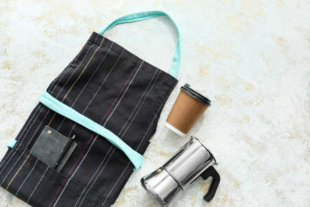 Apron, paper cup and cezve on light background