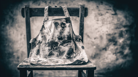 A vintage art apron rests on a wooden chair, creating a nostalgic and artistic atmosphere in a studio setting with a textured backdrop.