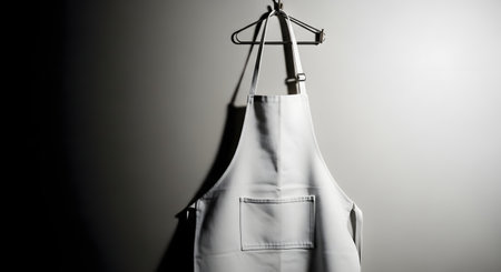 A crisp white apron hangs on a metal hanger, casting a shadow on a textured, dark gray wall. The image focuses on the simple, clean design of the garment.
