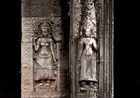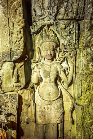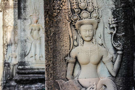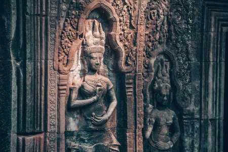 Detail of bas relief sculpture the wall of the ancient Ta Prohm temple in the Angkor Thom Area, Siem Reap, Cambodia. Popular travel destination of Siem Reap, Cambodia.