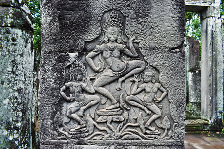 Beautiful Cambodian women dancing Apsaras. Old Khmer art carvings on the wall of Prasat Bayon, the central temple of Angkor Thom Complex, Siem Reap, Cambodia.