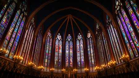 The interior of a beautiful church elaborate features stained glass windows that cast colorful light. The gothic architecture enhances the serene atmosphere, perfect for worship and reflection.