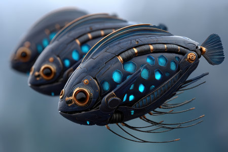 Three robotic fish glide gracefully through a serene underwater world, each with unique designs.