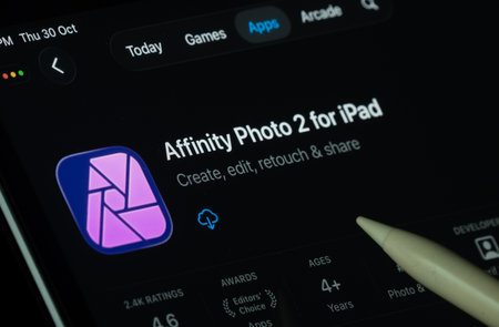 Dhaka, Bangladesh- 30 Oct 2025: Affinity Photo 2 app displayed on a iPad screen in dark mode with a digital pen pointing at it.