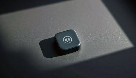 Wireless Button. A sleek black wireless button with a power symbol on a dark surface.