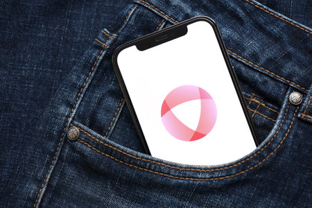 KYIV, UKRAINE - FEBRUARY 23, 2024 Open logo of famous dating website or app on iPhone display screen close up