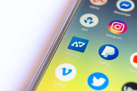 Melbourne, Australia - July 23rd 2019: Afterpay's mobile application icon, surrounded by icons for finance and social media applications.