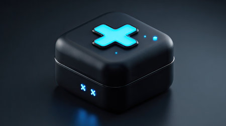 A close-up view presents a stylized black box featuring an illuminated cross symbol. The box is set against a dark background, highlighted by subtle light. This digital art piece displays a modern, polished aesthetic, potentially suitable for tech-related themes or conceptual design projects, offering versatile commercial applications.