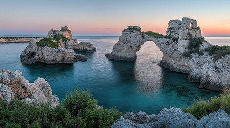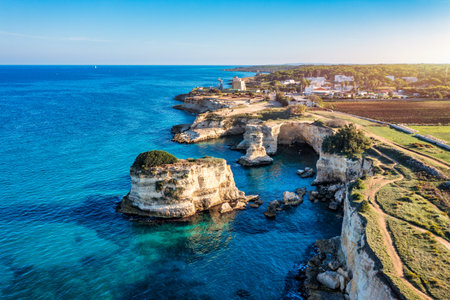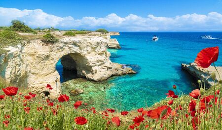 Picturesque seascape with cliffs, rocky arch at Torre Sant Andrea, Salento coast, Puglia region, Italy