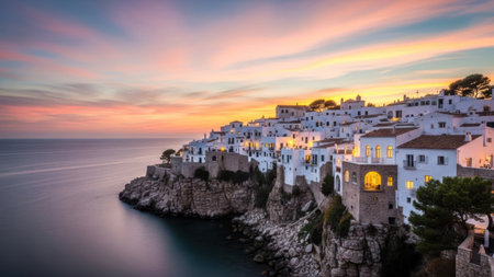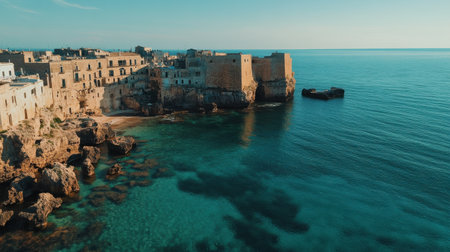 The warm glow of sunset illuminates the stunning cliffs and vibrant houses of Polignano a Mare, as crystal-clear waters lap against the white sandy beaches below.