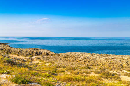 The important archaeological site and tourist resort of Roca Vecchia, in Puglia, Salento, Italy. Turquoise sea, blue sky, rocks, sun, lush vegetation in summer. Basiliane Caves (VIII century)