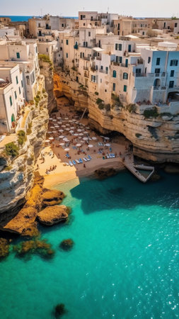 Houses on dramatic cliffs over Adriatic sea in Polignano a Mare, Italy, sunny summer day