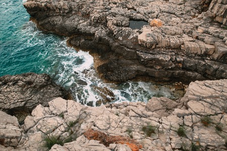 Rocks on the sea in Montenegro. Rocky coast. Wild beach. Dangerous coast.
