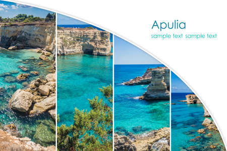 Apulia collage with copy space for text. Torre Sant Andrea near Torre dellOrso, Salento, Puglia, Italy. Rocky sea coast with cliffs. Beaches with turquoise clear water. Beautiful postcard mockup.