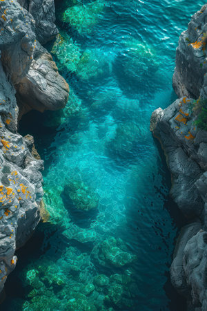 AI Generated. Breathtaking view of coastal cliffs with turquoise water and hidden beach