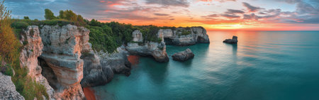 The vibrant sunset casts a warm glow over the coastal cliffs of Gargano National Park, where lush vegetation meets the rocky shores of the Adriatic Sea, creating a stunning landscape.