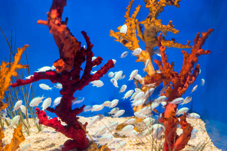 Group of fish underwater floating near the reef. Underwater world