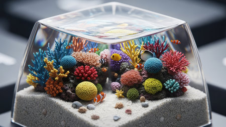 This image showcases a unique keyboard keycap resembling a miniature aquarium. It displays vibrant coral formations, small fish, and textured sand. The design incorporates multiple colors and intricate details. The overall composition suggests a decorative or artistic application, potentially suitable for design or technology-related projects.