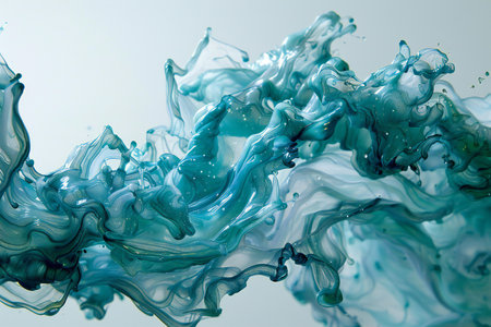 A close-up of liquid acrylic paint in shades of green and turquoise, showcasing a smooth, flowing texture. The rich colors blend beautifully, with hints of white adding a sense of motion.