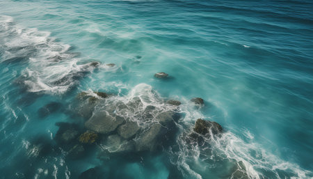 An aerial perspective showcases ocean waves in shades of deep blue and white foam. The image captures the movement and texture of water, with visible patterns of waves. This composition, likely taken from above, depicts a dynamic scene suitable for various commercial and editorial applications, emphasizing natural elements.
