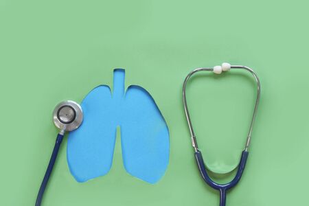Lung health therapy medical concept . silhouette of the lungs and a stethoscope on a green background. concept of respiratory disease, pneumonia, tuberculosis, bronchitis, asthma