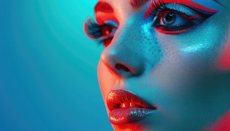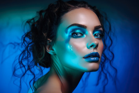 Close-up portrait of a beautiful woman with neon blue eyeshadow and glossy lips, set against a bright neon blue background