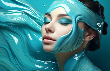 Creative fashion beauty portrait of beautiful woman model with blue eyeshadows and blue liquid.AI Generative.
