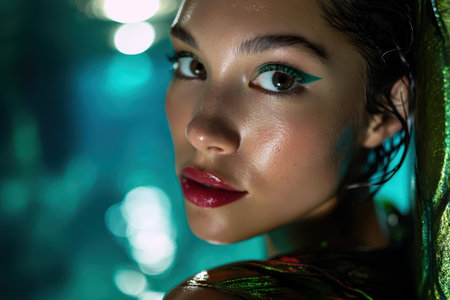 Young woman with intense gaze and green eyeliner, wet hair, metallic sheen on shoulder, vivid red lipstick, in a mysterious, softly lit setting with blurred circles in background