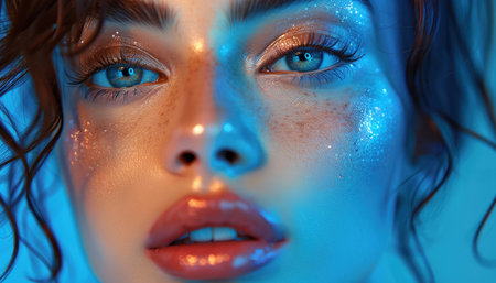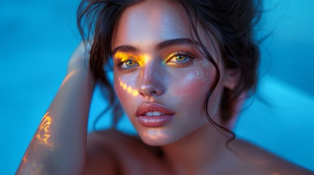 A striking portrait of a woman with glowing makeup in blue tones, set against a soft background.