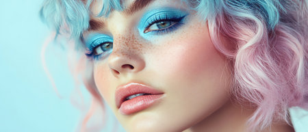 Woman with pastel curls, bold blue eyeshadow, futuristic look