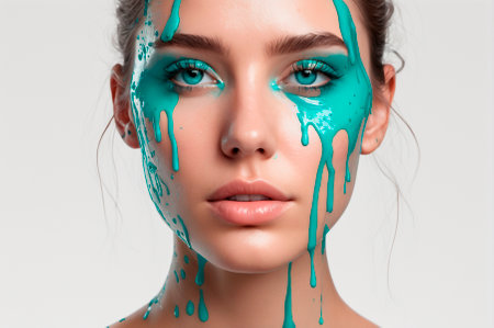 Woman's face splattered with turquoise paint, white background. Generative AI.